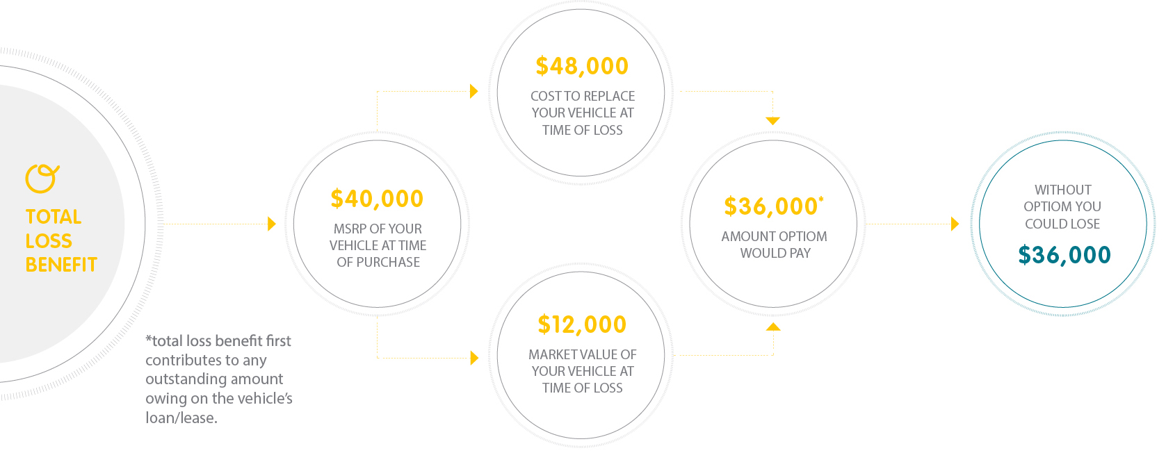Optiom provides comprehensive vehicle replacement protection whether you purchase or lease a new or used vehicle. It also contributes towards any outstanding loan/lease obligations in the event the vehicle is a total loss and written off by the primary auto insurer.